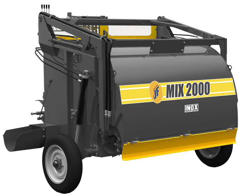 Vagão misturador tracionado com capacidade para 2 m³, fabricado em aço inoxidável, equipado com rosca misturadora e braço desensilador com tambor de desensilar. O sistema de desensilagem inclui facas cruzadas substituíveis de forma independente. Possui fresa com sensor de pressão, conjunto de rosca de descarga com mancal e rosca removível, além de desensilador com balanceamento dinâmico. Inclui rótula e rolamento autocompensador para autoalinhamento do eixo do desensilador (fresa), tanque de óleo blindado e proteção traseira do rolo desensilador. A rosca para descarga é projetada para descarregar diretamente no cocho. A transmissão é feita por uma caixa de engrenagens banhada a óleo e correntes totalmente dimensionadas para suportar os esforços exigidos. O acionamento do desensilador é realizado por bomba hidráulica e articulação por pistão, enquanto as rodas são acionadas pelo sistema hidráulico do trator. A potência mínima requerida é de 50 cv.
